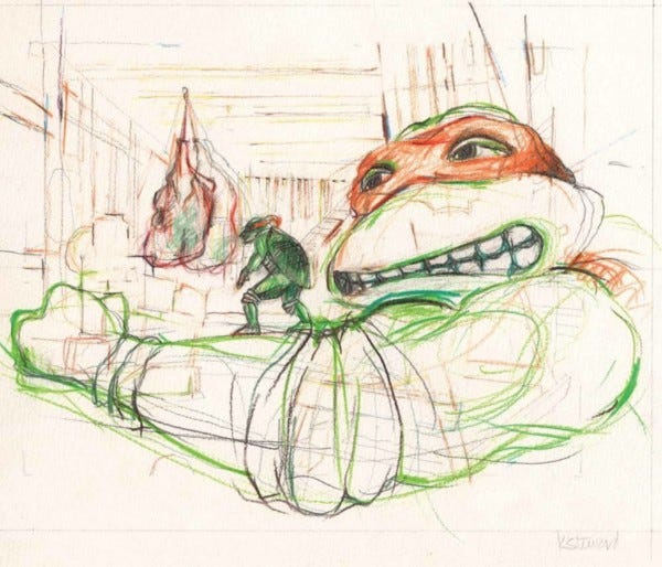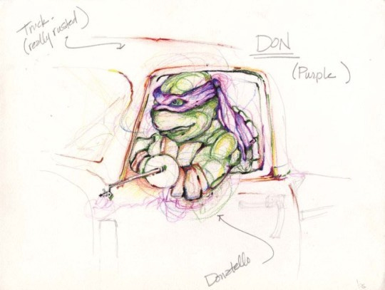 Leo is driven by ambition, honor, and loyalty. In this sketch from the original 1990 live-action turtles movie, April O’Neil’s character depicts Leo waiting faithfully over his injured brother, Raphael.
