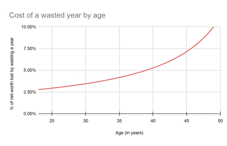 This chart does something similar and probably better: it shows you what % of your life you're sacrificing as you continue to move in a direction you don't want to go or to work at a job you hate.