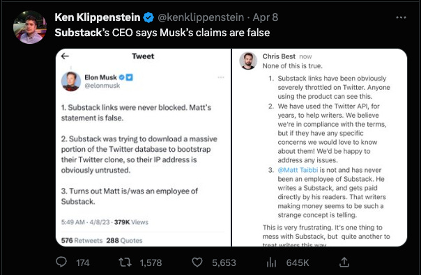 Here’s a quick summary of an exchange that happened between Elon Musk (The CEO and co-owner of Twitter) and Chris Best (Substack’s CEO).