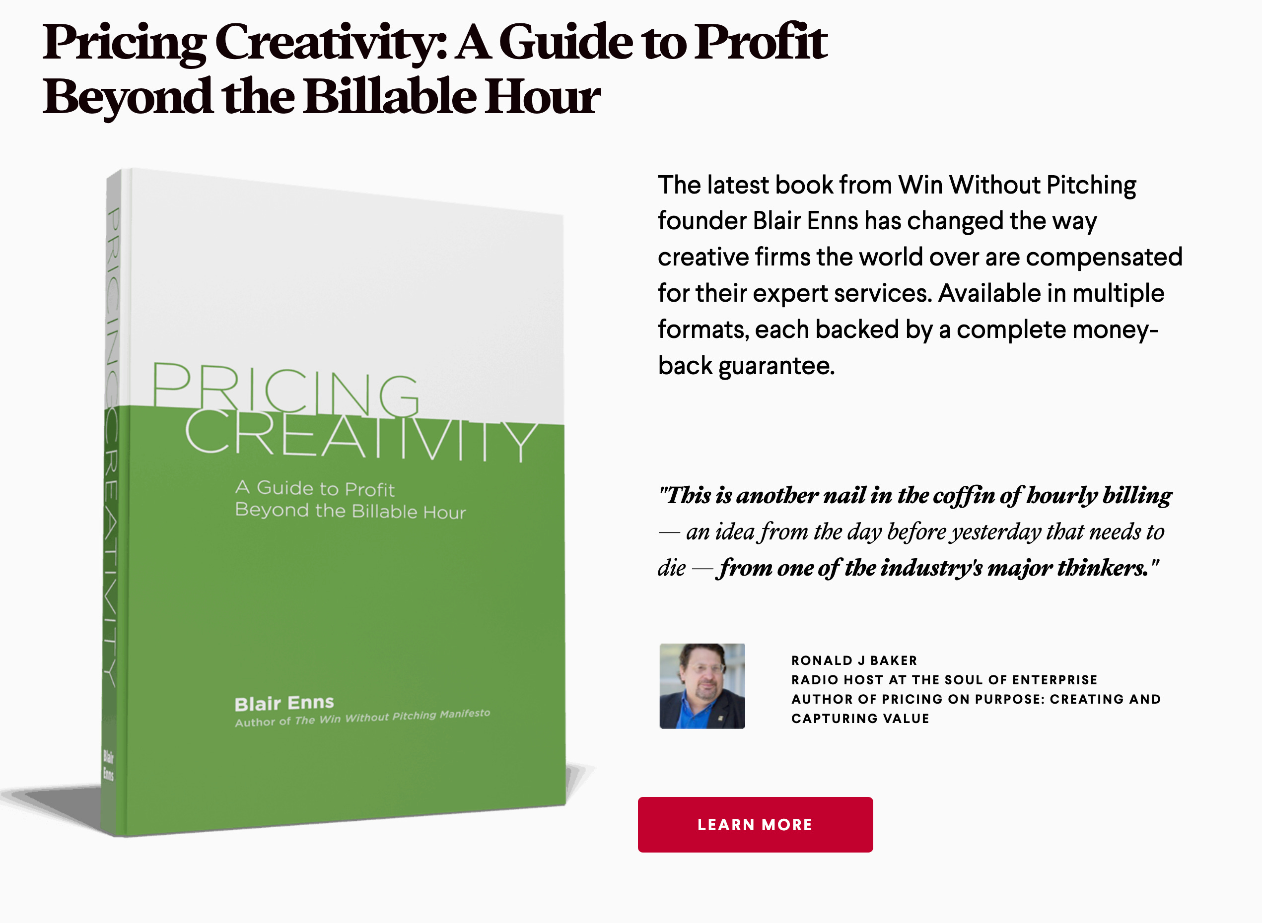 Coined in his book “Pricing Creativity,” author Blair Enns defines Value-Pricing loosely as uncovering the estimated or perceived value of a product or service to a client.