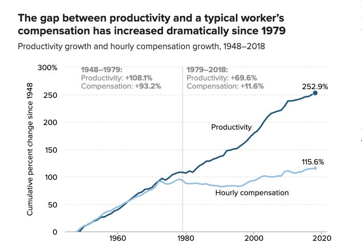 What this graph shows is that American workers were doing a great job at creating and sustaining new value for American businesses. The only trouble is that they stopped getting paid for their work somewhere in the 70s, right around the time Friedman was convincing businesses to focus on growth.