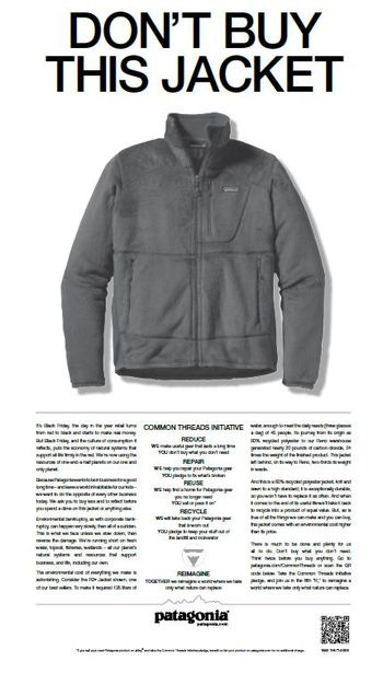 Years ago, Patagonia ran a full-page ad in the New York Times telling consumers not to buy their new jacket.